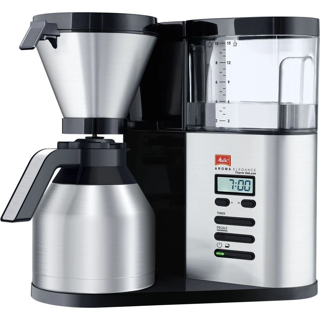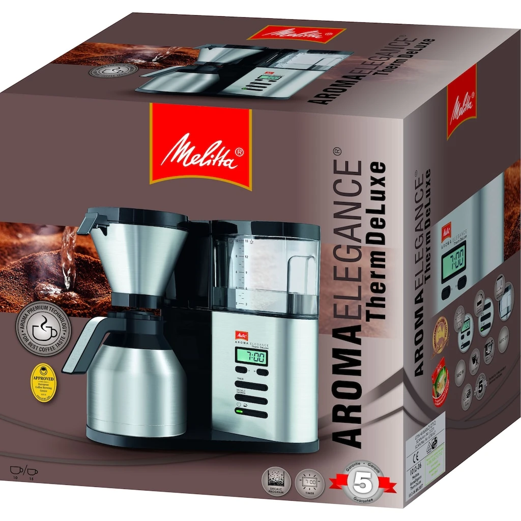 | Weitere Vorteile | Es handelt sich bei der AromaElegance® Therm Deluxe um eine Kaffeemaschine mit Timer. Über die LED-Anzeige kann der Timer minutengenau eingestellt und leicht abgelesen werden.Auch optisch ein Hingucker – das hochwertig verarbeitete Edelstahl Gehäuse der AromaElegance® Therm Deluxe vermittelt direkt einen exklusiven Eindruck. Das Erscheinungsbild wird durch die angenehme Haptik der Edelstahlelemente der Abdeckungen von Wasserfilter und Schwenkdeckel abgerundet.Kaffeemaschine plus Thermkanne! Der frisch gebrühte Kaffee wird mittels bruchsicherer Thermkanne besonders lange warm gehalten. Der Kaffee kann ganz bequem einhändig eingeschenkt werden, dank des Easy Click Deckels muss kein Deckel aufgedreht werden.Nützliche Vorteile hat die 3-in-1 Calc Protection Funktion zu bieten. Das Gerät erkennt durch die individuell einstellbare Wasserhärte wann eine Entkalkung notwendig ist und macht sich folgend durch eine aufleuchtende LED bemerkbar. Das integrierte Entkalkungsprogramm sorgt für eine gründliche Entkalkung.Der perfekte Begleiter für Liebhaber des aromatischen Kaffees: die AromaElegance® Therm Deluxe Filterkaffeemaschine. Der Kaffee entfaltet sein ganzes Aroma mit einem Knopfdruck auf die Aroma Control Taste. Ihrem Genussmoment steht durch die perfekte Steuerung der Brüheinheit mit der Aroma Premium Technologie nichts mehr im Weg. |